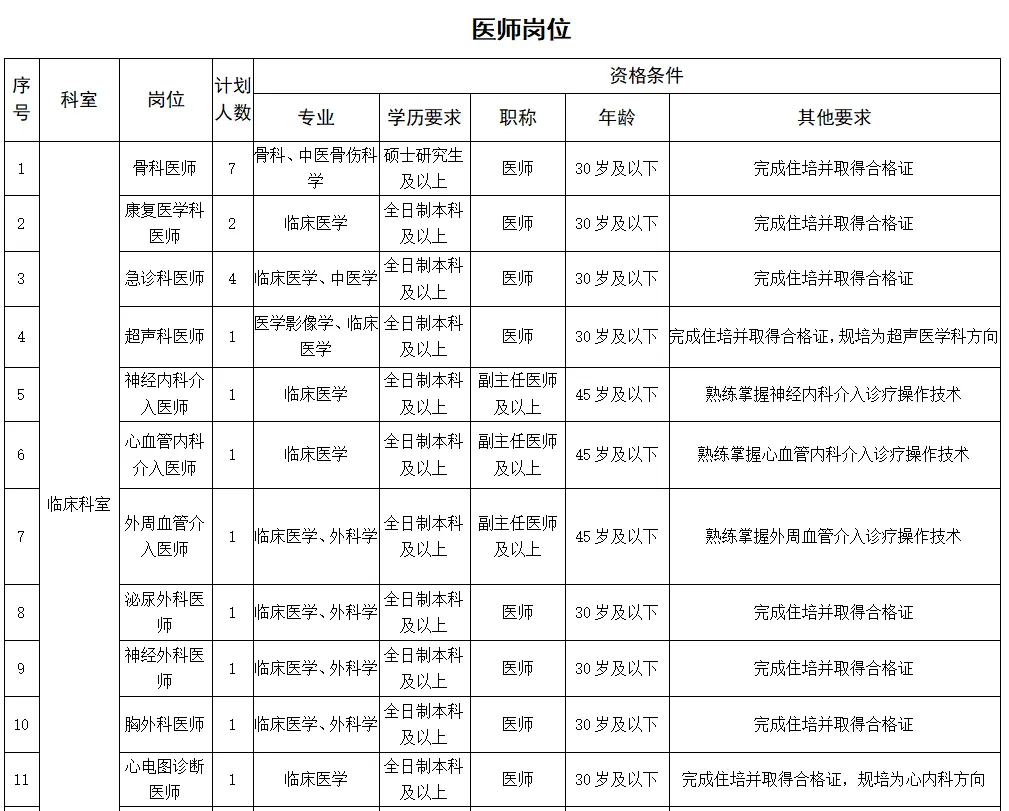 備注:醫(yī)學(xué)類碩士研究生及以上學(xué)歷、醫(yī)學(xué)類副高及以上職稱者不受招聘專業(yè)及名額限制。