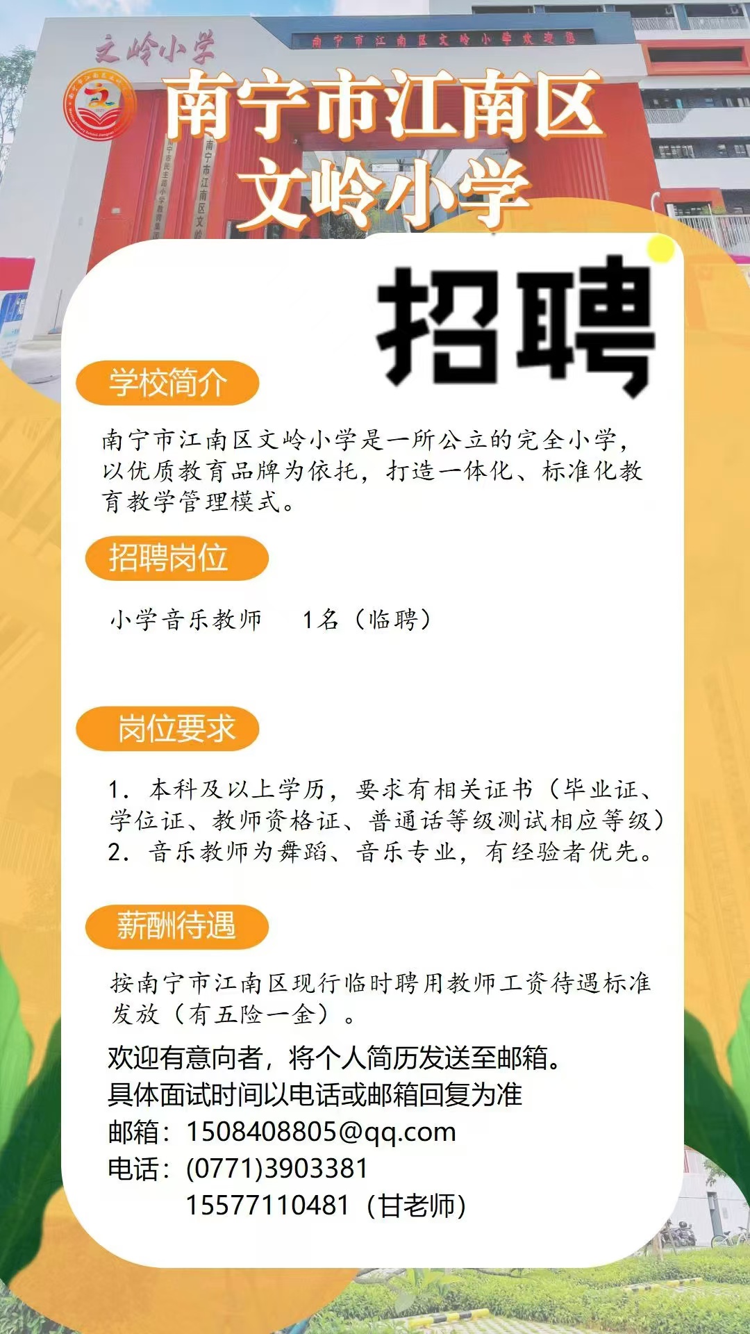 南寧市江南區(qū)文嶺小學招音樂老師