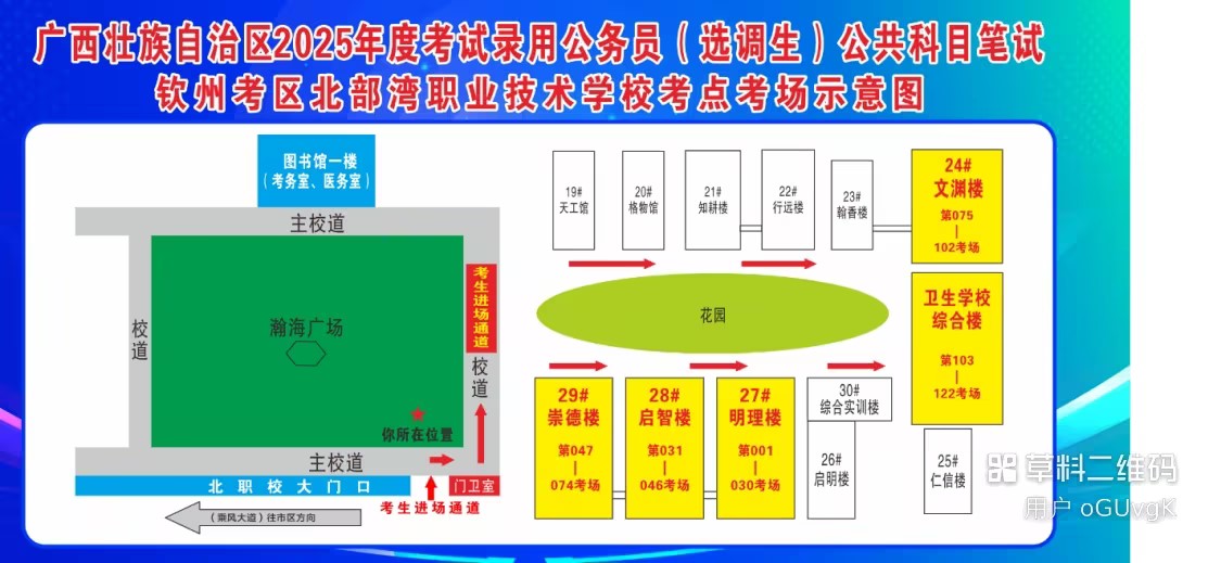 欽州考區(qū)共設(shè)兩個考點,分別為北部灣大學考點、北部灣職業(yè)技術(shù)學??键c。(考點地址和具體考場安排請掃附后的二維碼查看)