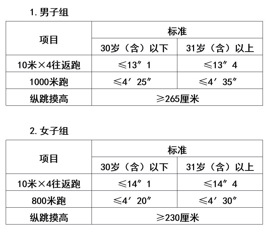 體能測(cè)評(píng)的項(xiàng)目和標(biāo)準(zhǔn)按照《關(guān)于印發(fā)〈公安機(jī)關(guān)錄用人民警察體能測(cè)評(píng)項(xiàng)目和標(biāo)準(zhǔn)〉的通知》(公政治〔2024〕60號(hào))執(zhí)行,其中綜合管理類(lèi)、執(zhí)法勤務(wù)類(lèi)職位測(cè)查全部3個(gè)項(xiàng)目,警務(wù)技術(shù)類(lèi)職位免予測(cè)查1000米(男)/800米(女)跑項(xiàng)目。對(duì)于專(zhuān)業(yè)人才緊缺難以形成競(jìng)爭(zhēng)的特殊職位(緊缺職位),體能測(cè)評(píng)三項(xiàng)中有兩項(xiàng)達(dá)標(biāo)的,視為合格。凡應(yīng)測(cè)項(xiàng)目中任意一項(xiàng)不達(dá)標(biāo)的,即為體能測(cè)評(píng)不合格。具體如下: