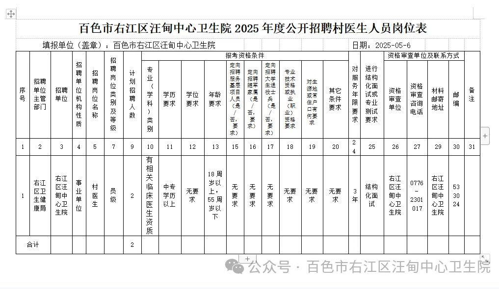 汪甸中心衛(wèi)生院位于百色市境西北部,距市區(qū)51公里,距田林縣城區(qū)16公里,東臨龍川鎮(zhèn),南與永樂(lè)接壤,西與田林相鄰,北與凌云交界,我院主要為轄區(qū)居民提供基本公共衛(wèi)生及基本醫(yī)療服務(wù)。因業(yè)務(wù)發(fā)展需要,面向社會(huì)招聘村醫(yī)生2名,具體要求如下: