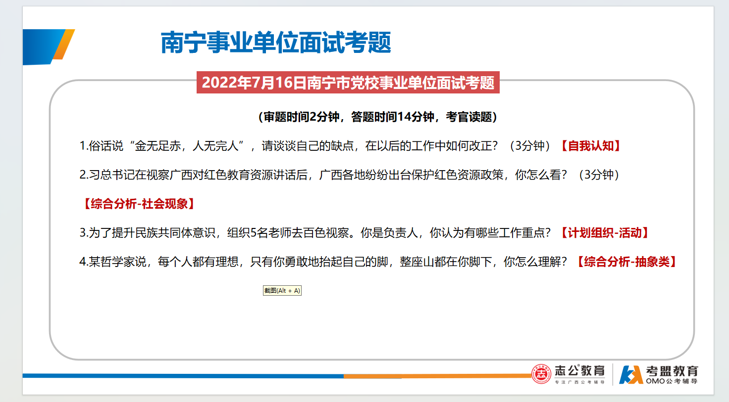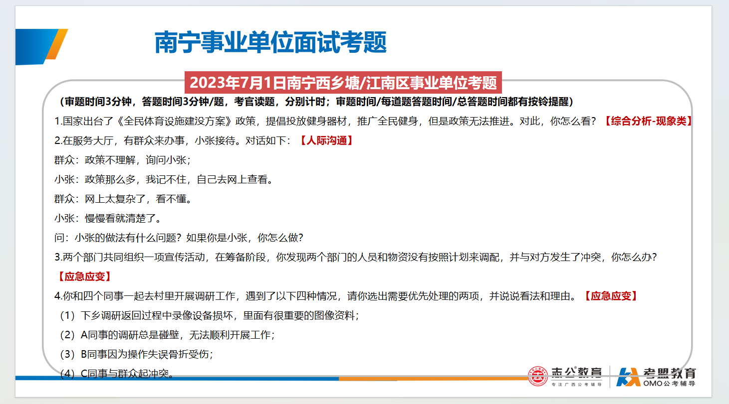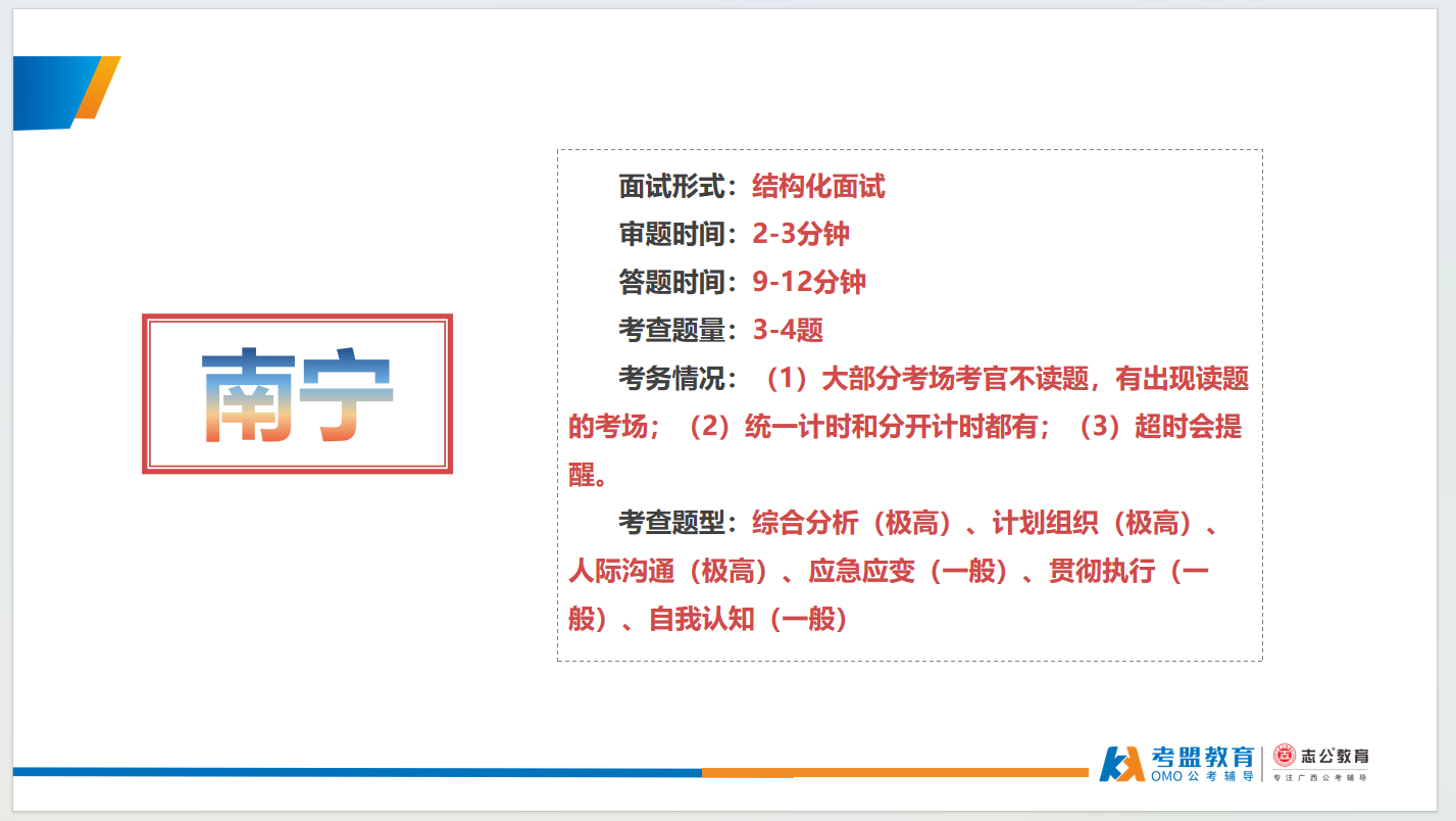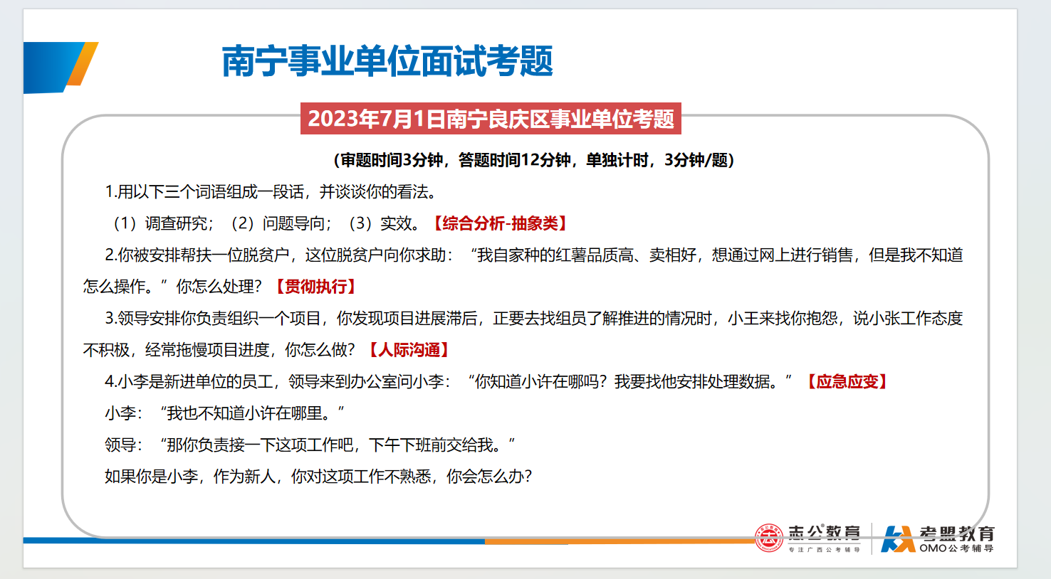 南寧事業(yè)單位面試主要采用結(jié)構(gòu)化面試形式、考查題量有3-4題,答題時間為9-12分鐘,考查題型:綜合分析(極高)、計劃組織(極高)、人際溝通(極高)、應(yīng)急應(yīng)變(一般)、貫徹執(zhí)行(一般)、自我認(rèn)知(一般):