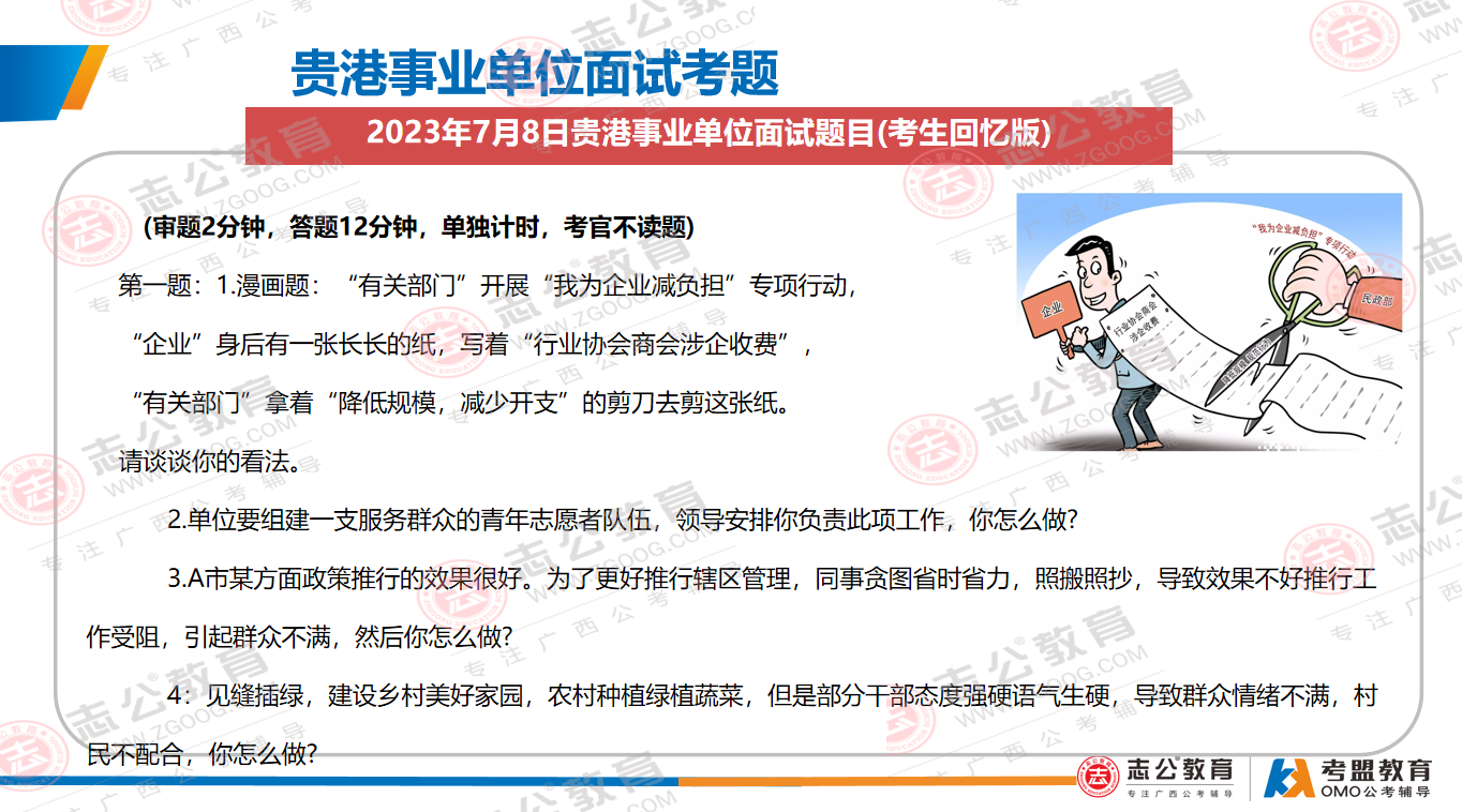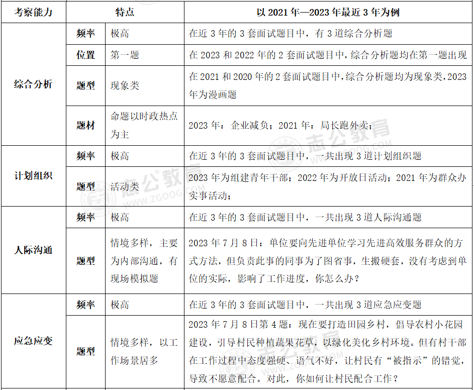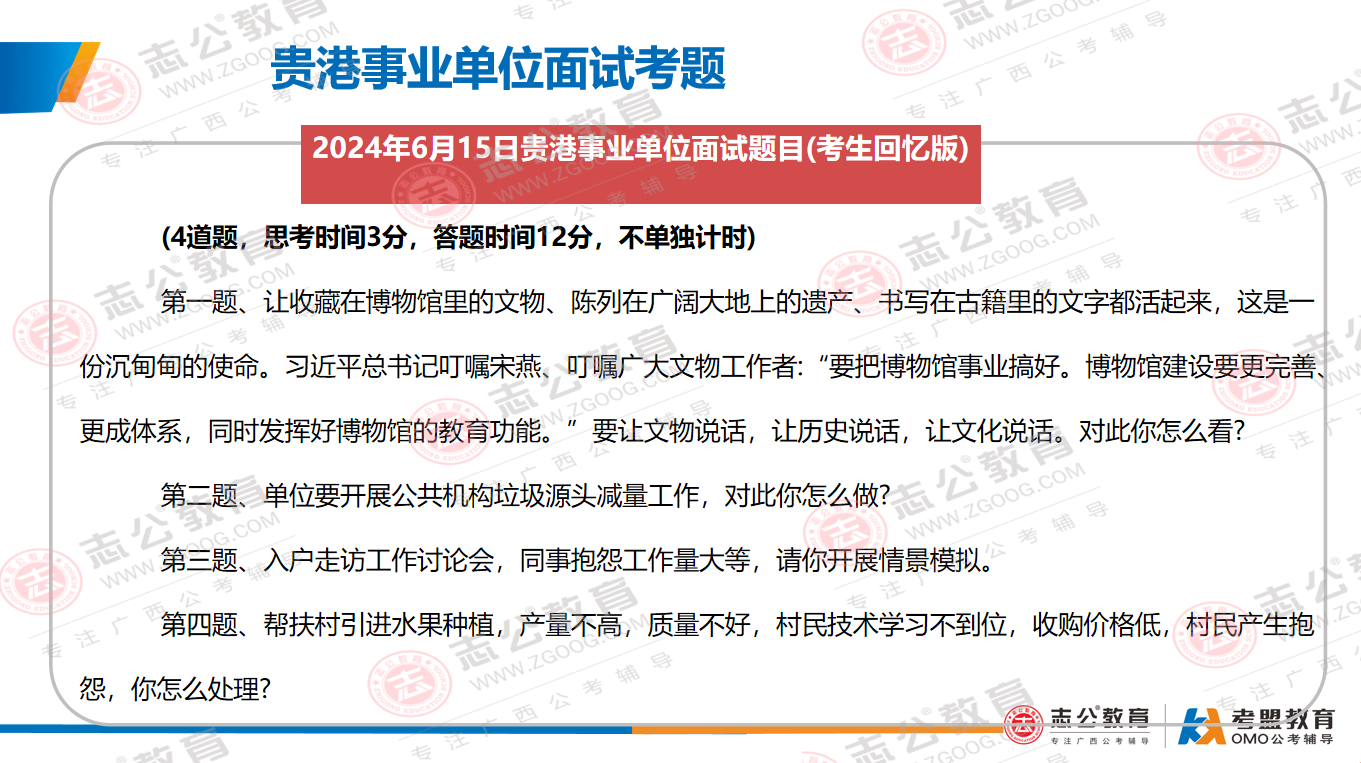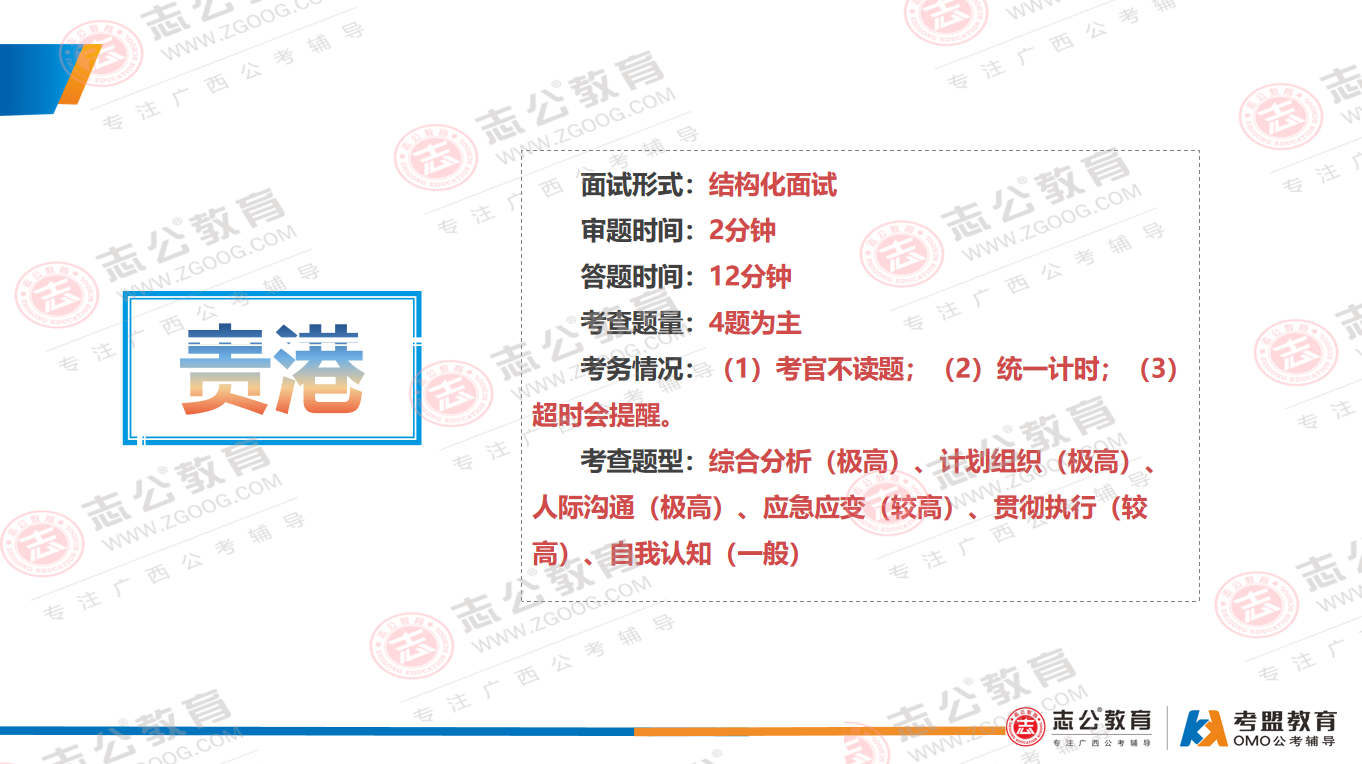 貴港事業(yè)單位面試主要采用結(jié)構(gòu)化面試形式;審題時間:2分鐘;答題時間:12分鐘;考查題量:4題為主??紕涨闆r:考官不讀題、統(tǒng)一計時、超時會提醒??疾轭}型:綜合分析(極高)、計劃組織(極高)、人際溝通(極高)、應急應變(較高)、貫徹執(zhí)行(較高)、自我認知(一般)。
