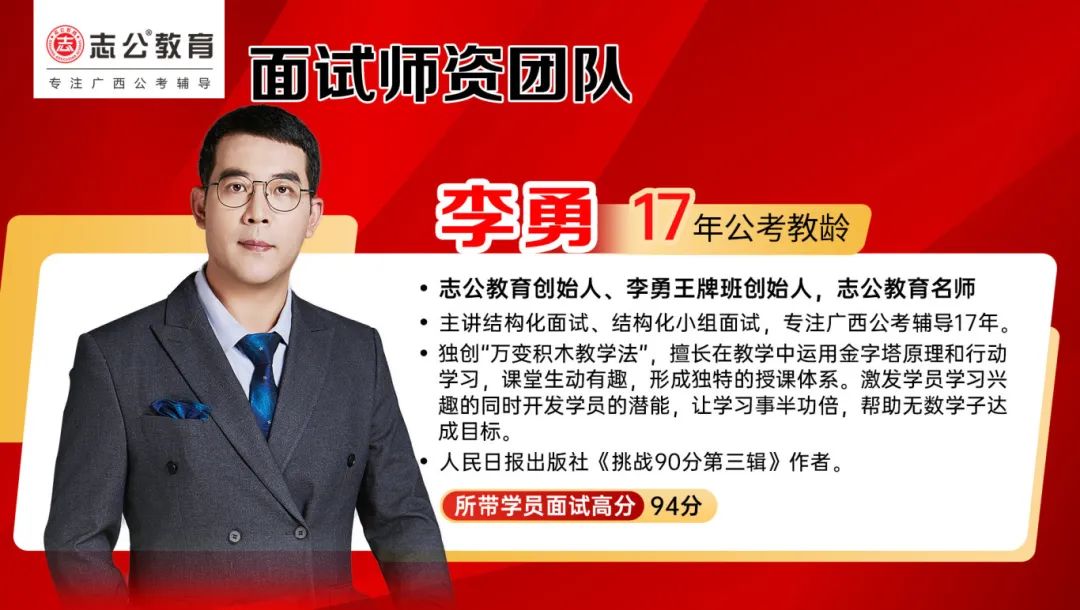 李勇——志公教育創(chuàng)始人、李勇王牌®班創(chuàng)始人,志公教育名師。主講結(jié)構(gòu)化面試、結(jié)構(gòu)化小組面試,專(zhuān)注廣西公考輔導(dǎo)17年。獨(dú)創(chuàng)“萬(wàn)變積木教學(xué)法”,擅長(zhǎng)在教學(xué)中運(yùn)用金字塔原理和行動(dòng)學(xué)習(xí),課堂生動(dòng)有趣,形成獨(dú)特的授課體系。激發(fā)學(xué)員學(xué)習(xí)興趣的同時(shí)開(kāi)發(fā)學(xué)員的潛能,讓學(xué)習(xí)事半功倍,幫助無(wú)數(shù)學(xué)子達(dá)成目標(biāo)。同時(shí)也是人民日?qǐng)?bào)出版社《挑戰(zhàn)90分第三輯》作者。
