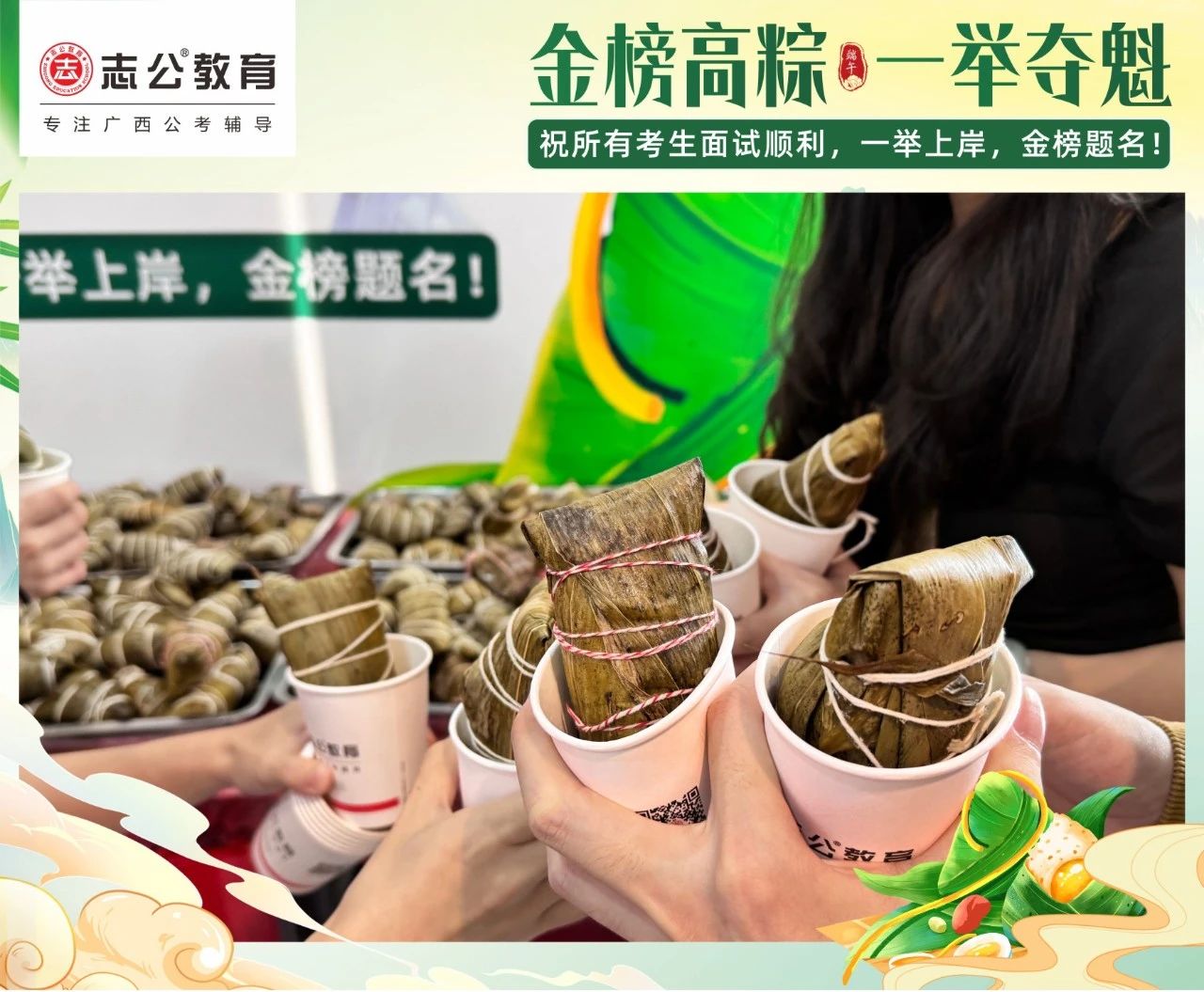 我們深知每一位學(xué)員為夢(mèng)想努力奮斗的不易。在這個(gè)端午節(jié),志公教育特別為地市學(xué)員準(zhǔn)備了剛出爐的新鮮粽子。希望大家在品嘗粽子的同時(shí),能感受到我們的支持與鼓勵(lì),在接下來的考試中一舉高 “粽”,實(shí)現(xiàn)自己的夢(mèng)想。