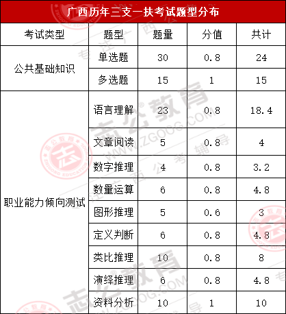 上篇我們寫到,三支一扶的待遇,在廣西這個(gè)待遇還算不錯(cuò),政策上的支持也非常好,那么預(yù)計(jì)這個(gè)月月底出公告的三支一扶,啥時(shí)候筆試呢?2024年廣西三支一扶筆試時(shí)間是7月13日,其筆試科目為《綜合知識(shí)》一科,滿分100分?;谕昕忌幕貞?,綜合知識(shí)內(nèi)容主要包括公共基礎(chǔ)知識(shí)和行測(cè)職業(yè)能力測(cè)試兩個(gè)科目,而各題型的題量及分值如下圖所示: