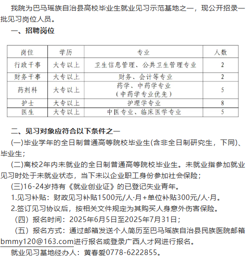 原文標(biāo)題:巴馬瑤族自治縣民族醫(yī)院2025年見(jiàn)習(xí)崗位招聘公告