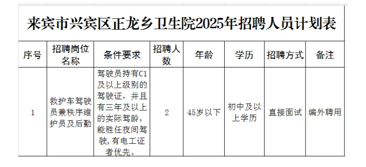 來(lái)賓市興賓區(qū)正龍鄉(xiāng)衛(wèi)生院2025開(kāi)招聘非醫(yī)學(xué)類(lèi)編外工作人員2人