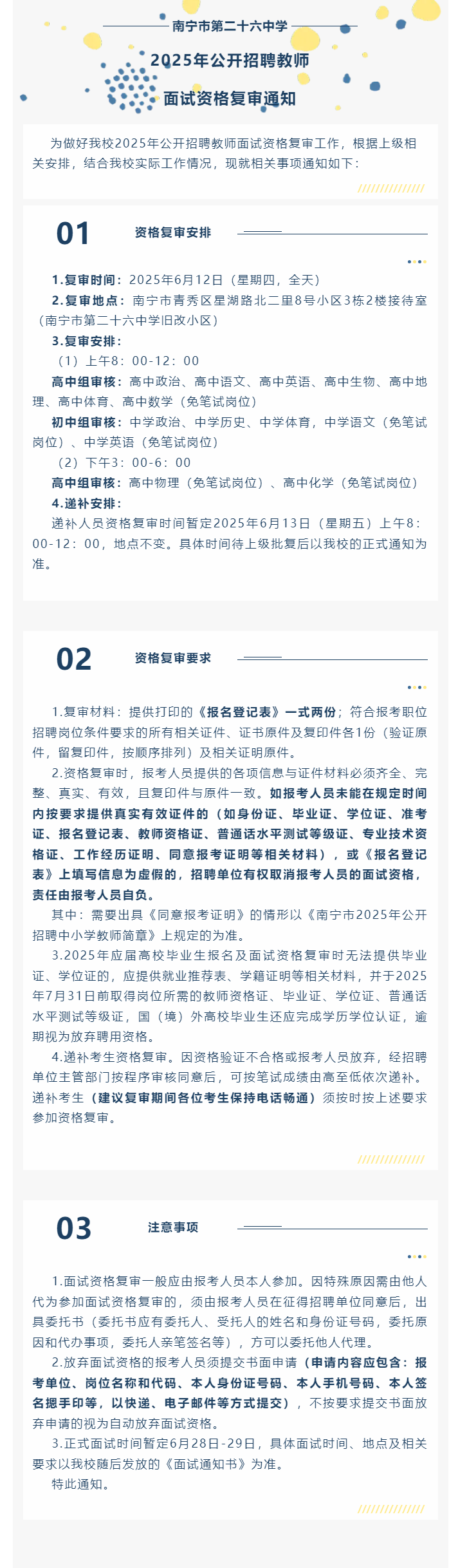 南寧市第二十六中學(xué)2025年公開招聘教師面試資格復(fù)審?fù)ㄖ?/h3>