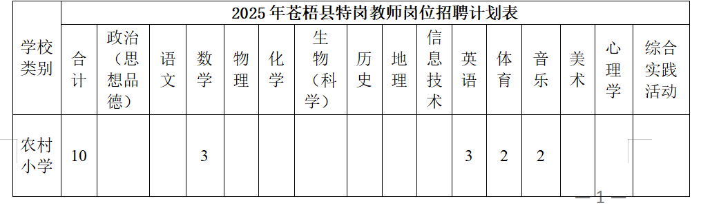 經自治區(qū)教育廳、財政廳、人社廳批準,今年我縣農村義務教育階段學校教師特設崗位計劃(以下簡稱“義教特崗”)10名,其中小學崗位10名(詳情見下表)。