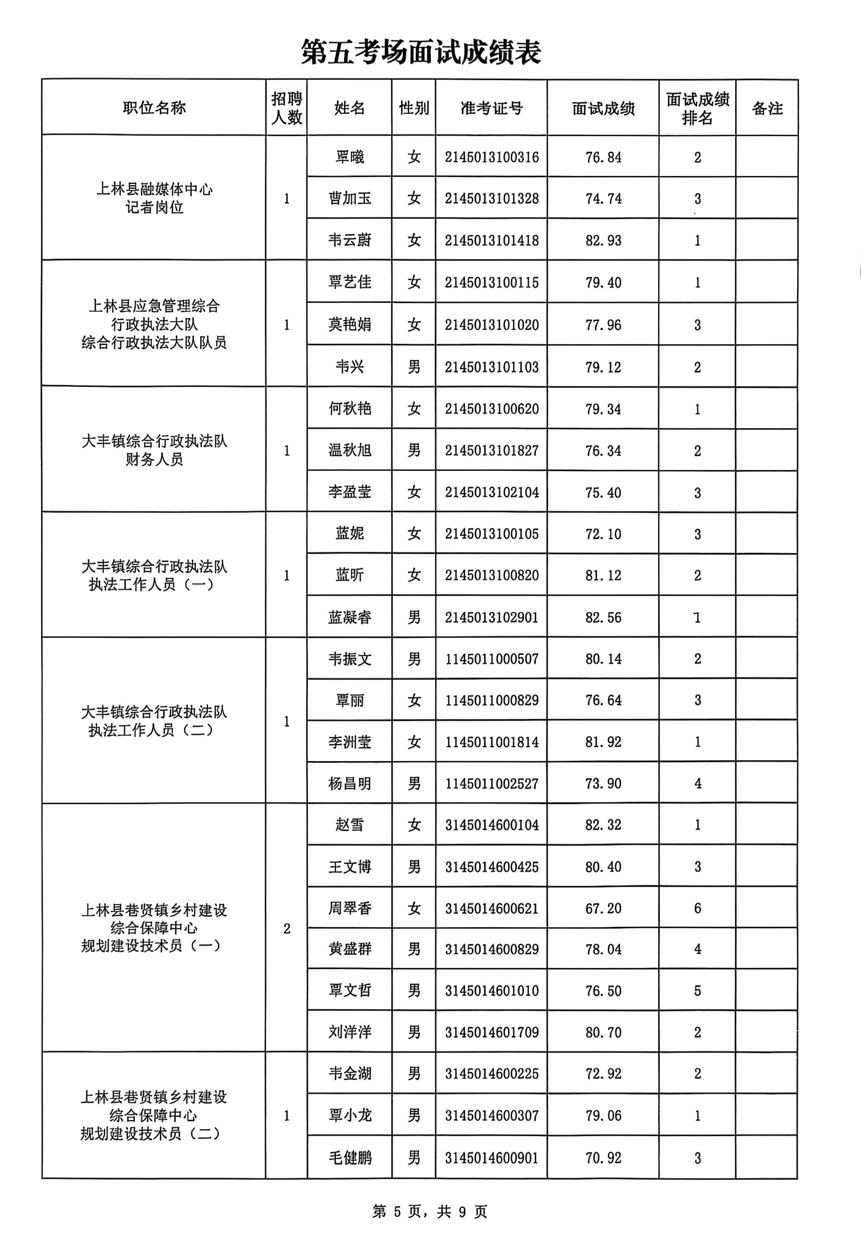 上林縣2025年公開考試招聘事業(yè)單位工作人員面試成績公布如下:
