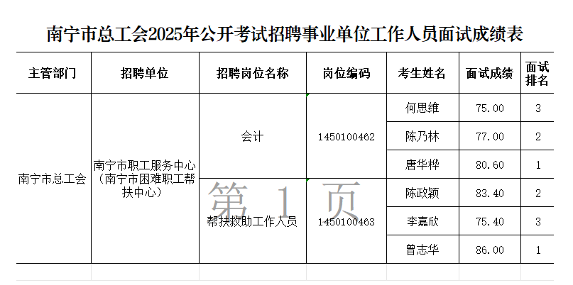 原文標(biāo)題:南寧市總工會(huì)2025年公開考試招聘事業(yè)單位工作人員面試成績(jī)表
