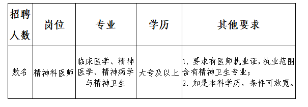 根據(jù)業(yè)務(wù)發(fā)展需要,持續(xù)加強我市心理健康和精神衛(wèi)生服務(wù)能力建設(shè),更好地滿足我市廣大人民群眾看病就醫(yī)需求,我院特面向社會公開招聘數(shù)名編制外聘用工作人員,現(xiàn)將有關(guān)事項公告如下: