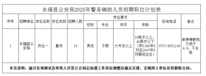 為進(jìn)一步加強(qiáng)公安機(jī)關(guān)警務(wù)輔助力量建設(shè),緩解警力不足壓力。根據(jù)《中華人民共和國勞動(dòng)合同法》《廣西壯族自治區(qū)人民政府辦公廳關(guān)于印發(fā)廣西公安機(jī)關(guān)警務(wù)輔助人員管理暫行辦法通知》《永??h公安機(jī)關(guān)警務(wù)輔助人員管理暫行辦法》等文件精神,決定面向社會(huì)公開招聘永??h公安局警務(wù)輔助人員。為確保招聘工作順利開展,現(xiàn)制定公告如下: