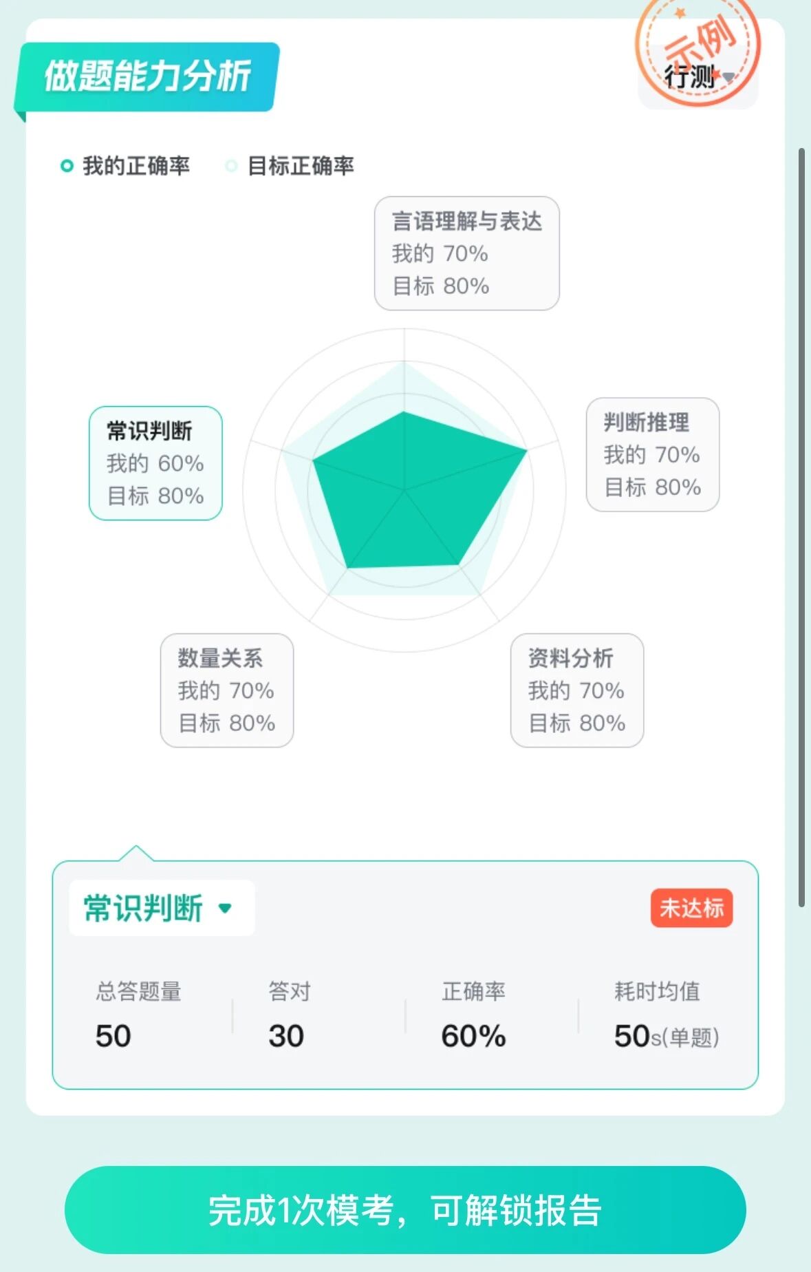 3??生成個人模考報告:考完就能查看??汲煽儭⑴琶敖馕?,生成的個人??紙蟾姘髂K正確率分布、做題能力分析、筆試分數(shù)yu測等內(nèi)容。