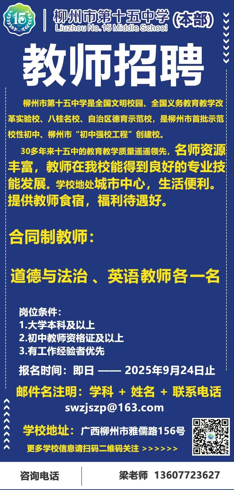原文標題:柳州市第十五中學(xué)本部招聘公告