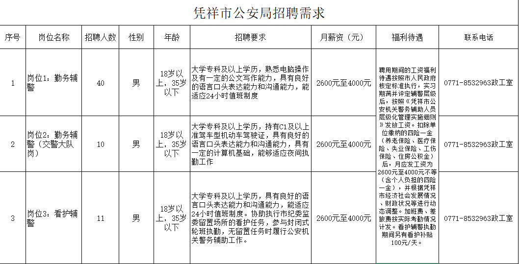(二) 報名地點憑祥市公安局(憑祥市北大路69號)報名及咨詢電話:0771-8532963報名投簡歷郵箱:pxgazgs@163.com報名請附上身份證復印件、學歷畢業(yè)證書復印件