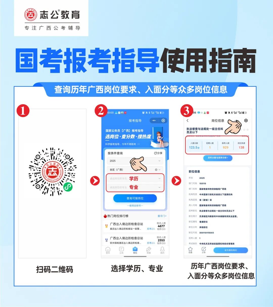 ?善用工具篩選:在志公教育研發(fā)的“公考天眼”小程序中,可獲可查詢歷年廣西崗位要求、入面分、報(bào)考人數(shù)等眾多崗位信息。