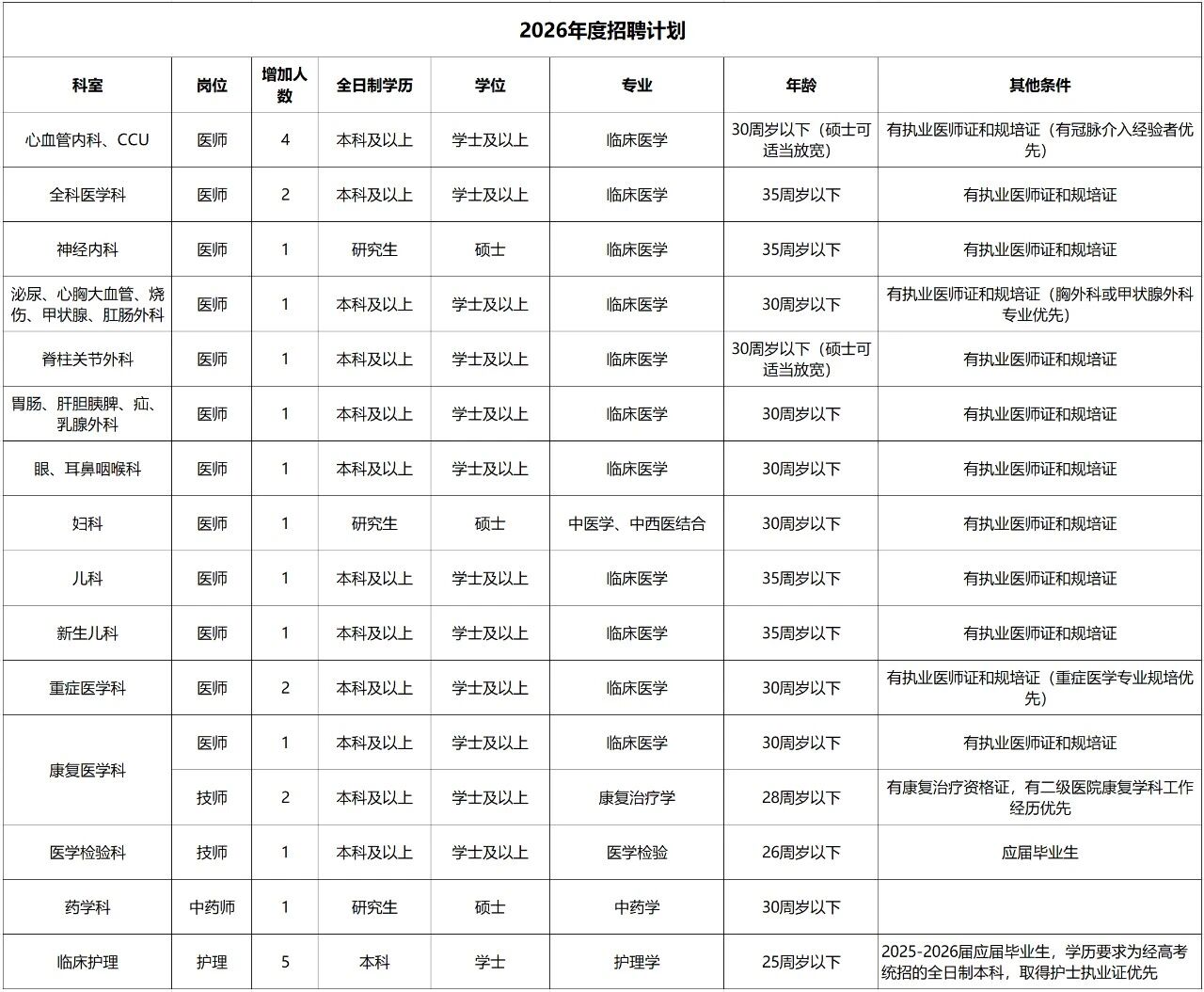 (二)醫(yī)院招聘的所有崗位均要求畢業(yè)時須同時取得應(yīng)聘崗位所需的學(xué)歷、學(xué)位證,緊缺崗位可放寬學(xué)位條件。同時須取得住院醫(yī)師規(guī)范化培訓(xùn)合格證書、醫(yī)師資格證書、醫(yī)師執(zhí)業(yè)證書。