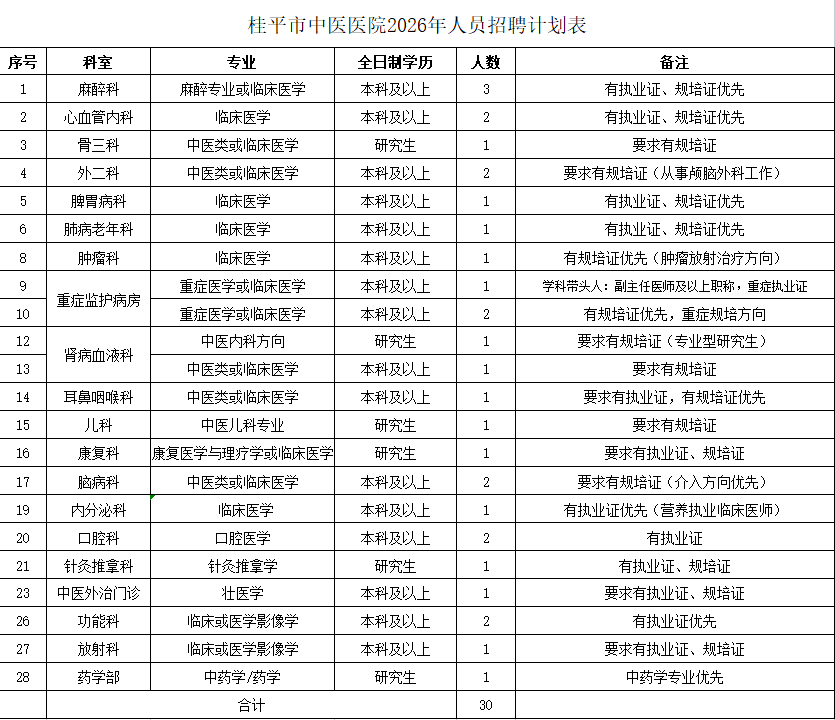 桂平市中醫(yī)醫(yī)院2026年招聘計劃表