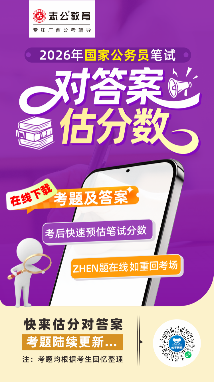 剛走下考場(chǎng)?志公教育為廣西考生整理了2026國(guó)考筆試考及答案在線下載服務(wù),推出在線估分平臺(tái),助你快速預(yù)估分?jǐn)?shù)。