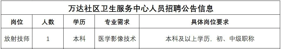 根據(jù)工作需要,銀山街道萬達(dá)社區(qū)衛(wèi)生服務(wù)中心現(xiàn)向社會(huì)招聘相關(guān)崗位人員,所有崗位按社區(qū)人員條件招聘,執(zhí)行社區(qū)待遇,具體崗位需求如下: