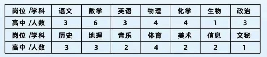學(xué)校于2023年9月1日正式開學(xué),現(xiàn)有30個(gè)行政班,一千余名學(xué)生,專任教師128人,發(fā)展勢(shì)頭強(qiáng)勁。為適應(yīng)學(xué)校未來發(fā)展需要,特面向全國(guó)師范類畢業(yè)生擇優(yōu)招聘青年教師若干,詳情如下: