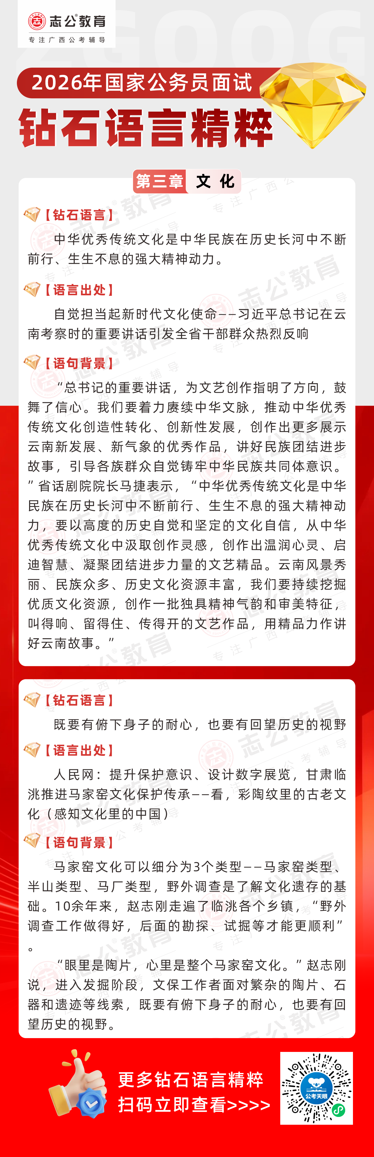 志公教育推出《2026國家公務(wù)員面試·鉆石語言精粹》!幫助考生把握文化類題目應(yīng)答邏輯,提升語言表達層次,助你在面試中脫穎而出。備考2026國考面試,從掌握“鉆石語言”開始!