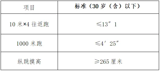 體能測(cè)評(píng)項(xiàng)目中,縱跳摸高的測(cè)試次數(shù)不超過3次,10米×4往返跑測(cè)評(píng)次數(shù)為2次,1000米跑的測(cè)評(píng)次數(shù)為1次。應(yīng)聘人員體能測(cè)評(píng)三項(xiàng)全部達(dá)標(biāo)的方為合格。